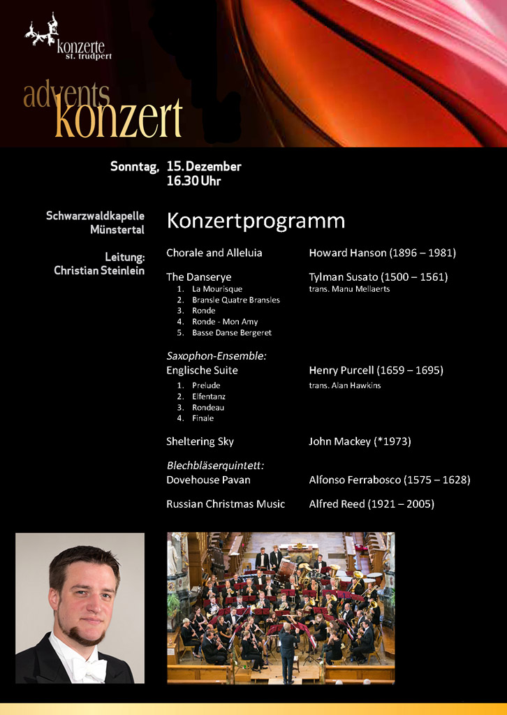 eine mehrsätzige Suite mit Renaissance-Musik von Tylman Susato. Neben dem großen Orchester sind mit einem Saxophon-Ensemble und einem Blechbläserquintett auch kleine Ensembles zu hören. Zum Abschluss erklingt "Russian Christmas Music", das die Zuhörer in die Weihnachtszeit des alten Russland entführt. "Russian Christmas Music" ist eines der absoluten Meisterwerke aus der Feder von Alfred Reed. Er kombiniert darin alle Elemente der Sinfonischen Blasmusik zu einem überwältigenden Klanggemälde aus Klangfarben und Klangkraft.
