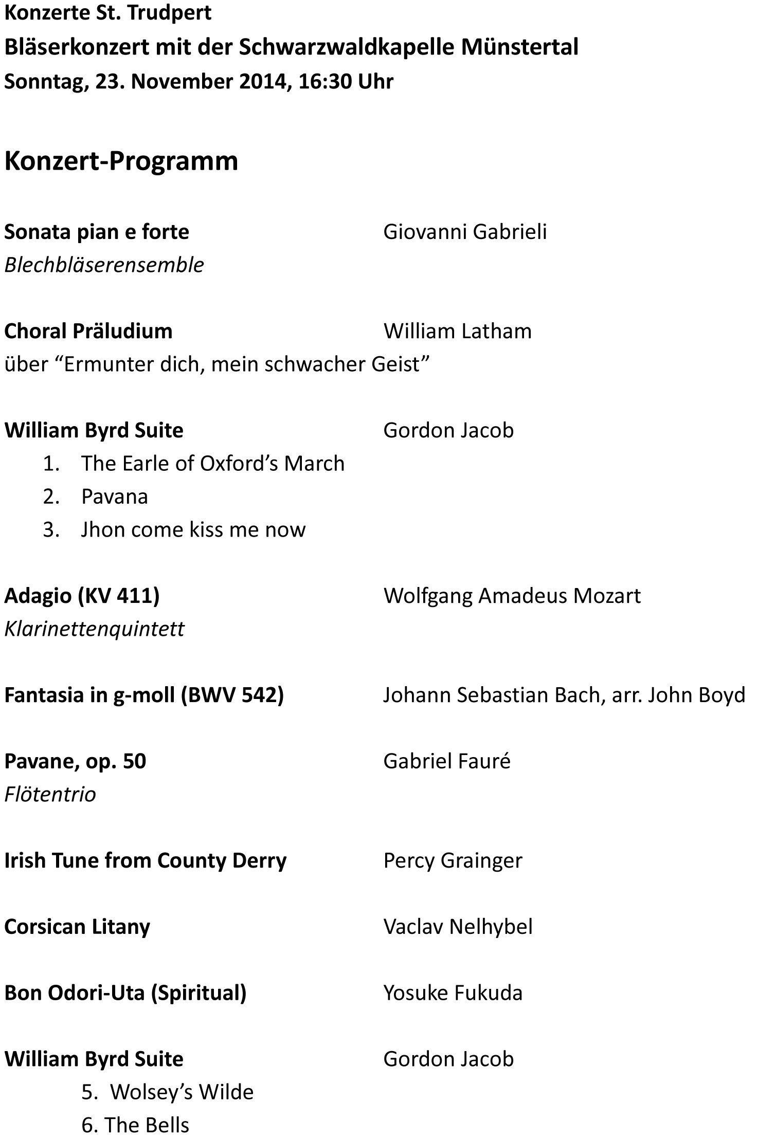 Die Schwarzwaldkapelle spielt Werke von J.S. Bach, William Byrd, W.A. Mozart und anderen. Es kommen sowohl originale Bläserwerke als auch Transkriptionen zur Aufführung. Neben dem großen Blasorchester bereichern kleinere Ensembles das Programm.