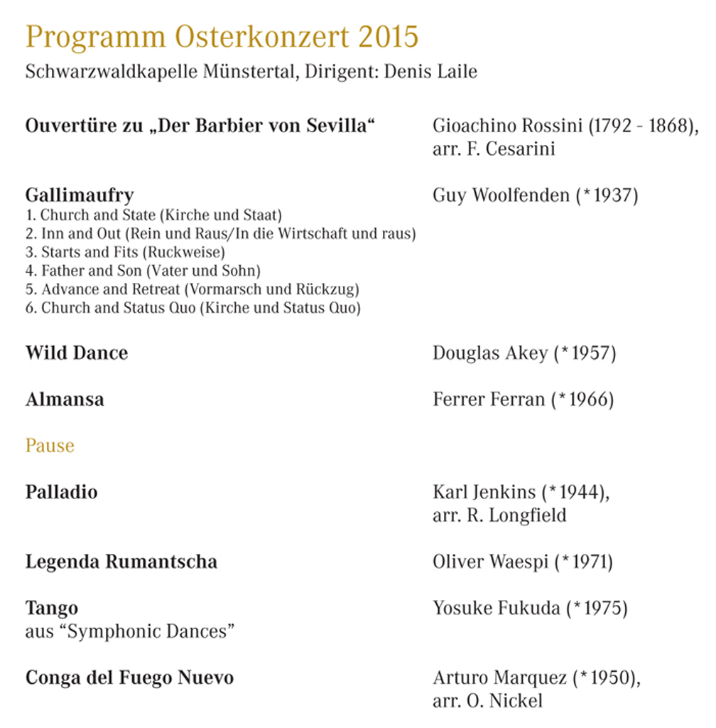 Dirigent Denis Laile hat bei der Programmgestaltung in diesem Jahr ganz bewusst auf ein Motto verzichtet und möchte die Vielfalt und Unterschiedlichkeit der Bläsermusik in den Vordergrund stellen. Sie hören unter anderem „Gallimaufry“, eine Schauspielmusik zu Shakespeares Stück „Henry V“ mit deutlichen Anklängen an die Musik der Renaissance und „Almansa“, das spanische und orientalisch-arabische Klänge in einem spannenden Tongemälde vermischt. Die „Legenda Rumantscha“ vereint sechs rätoromanische Lieder aus Graubünden in einer wunderbaren Rhapsodie. Lateinamerikanische Musik beschließt das Konzert.