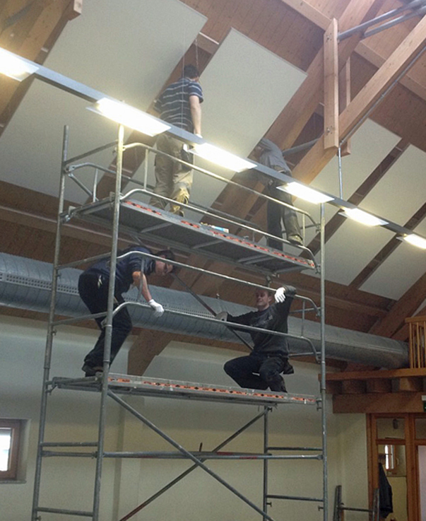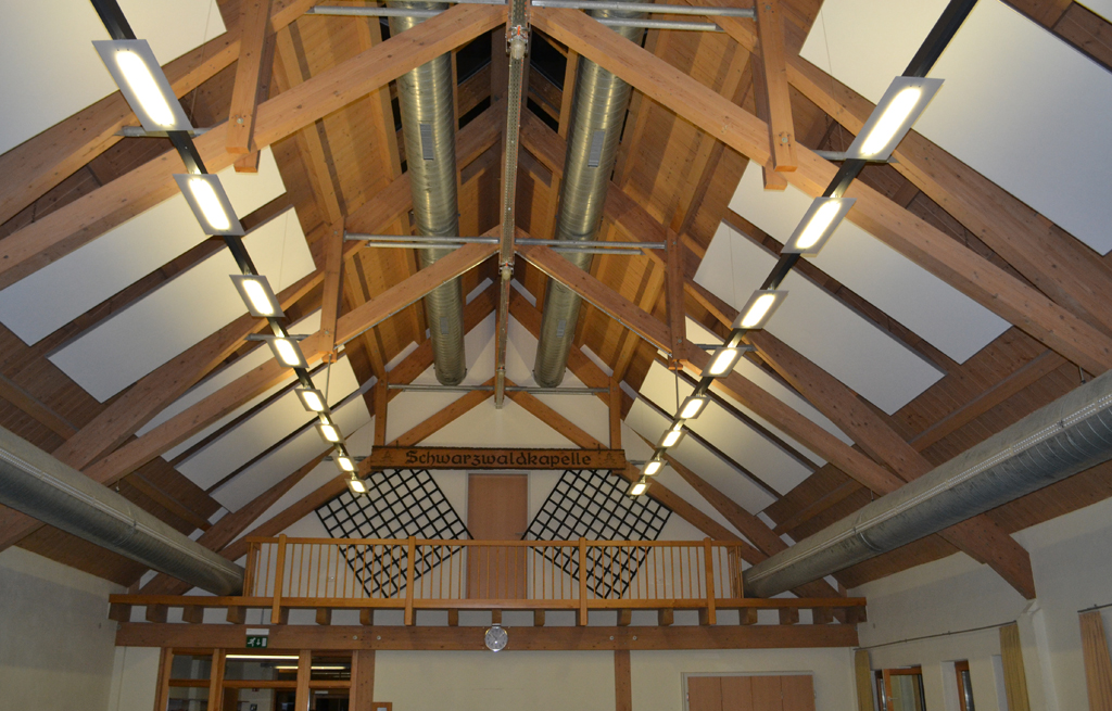 Davor war die Akustik des Raums extrem hallig und deshalb sehr ungünstig. Das erschwerte die Probenarbeit erheblich. Eine von der Schwarzwaldkapelle initiierte Messung durch eine Fachfirma bestätigte das subjektive Empfinden: Die Nachhallzeit lag weit über den empfohlenen Richtwerten und auch noch deutlich über dem, was als "noch erträglich" durchgehen kann. Die Berechnungen der Firma zeigten aber auch, dass durch den Einbau von entsprechenden Akustikelementen eine deutliche Verbesserung erzielt werden könnte. Nachdem die Gemeinde den Antrag auf Übernahme der Materialkosten mit dem Haushaltsplan 2015 bewilligt hat, wurden die Akustikelemente bestellt und nun an den Dachschrägen des Proberaums installiert.