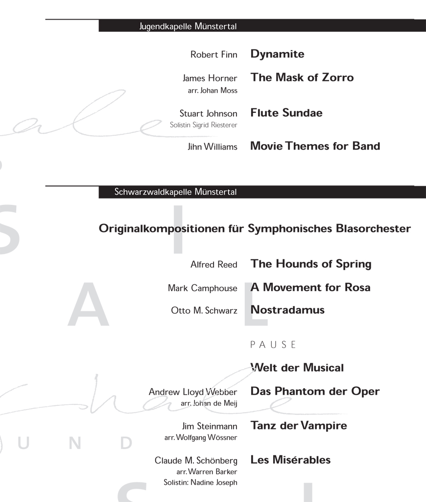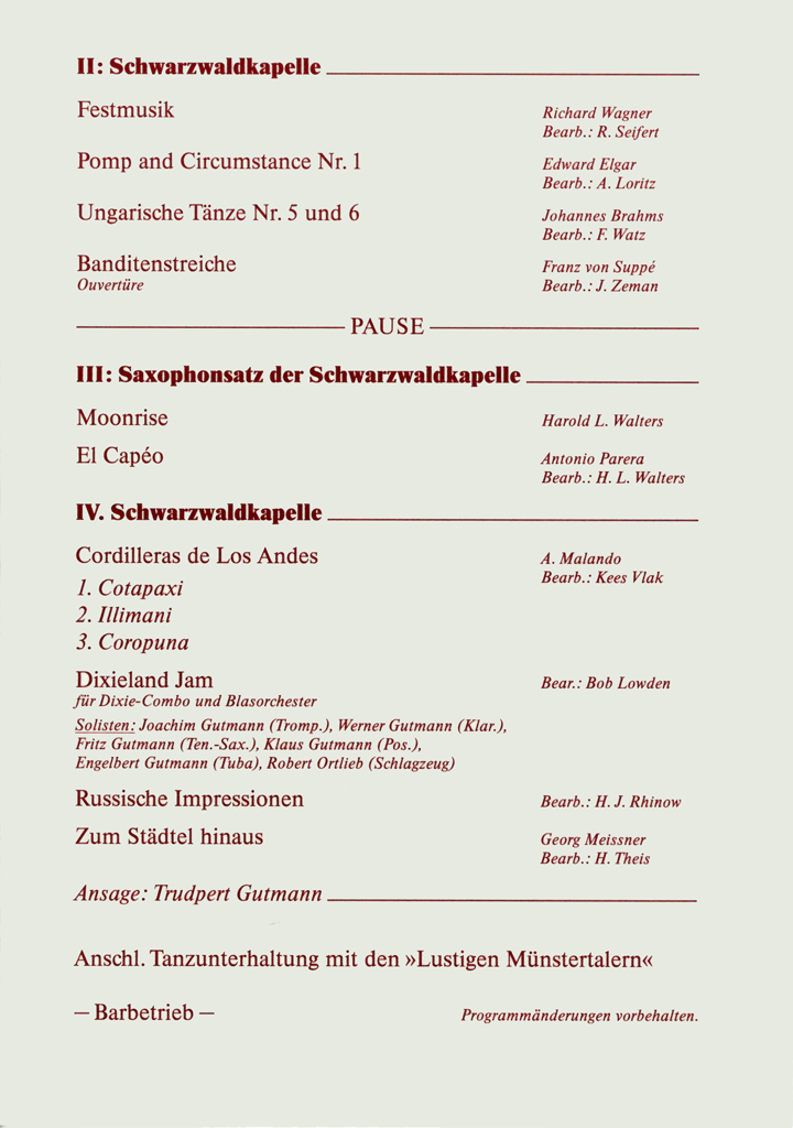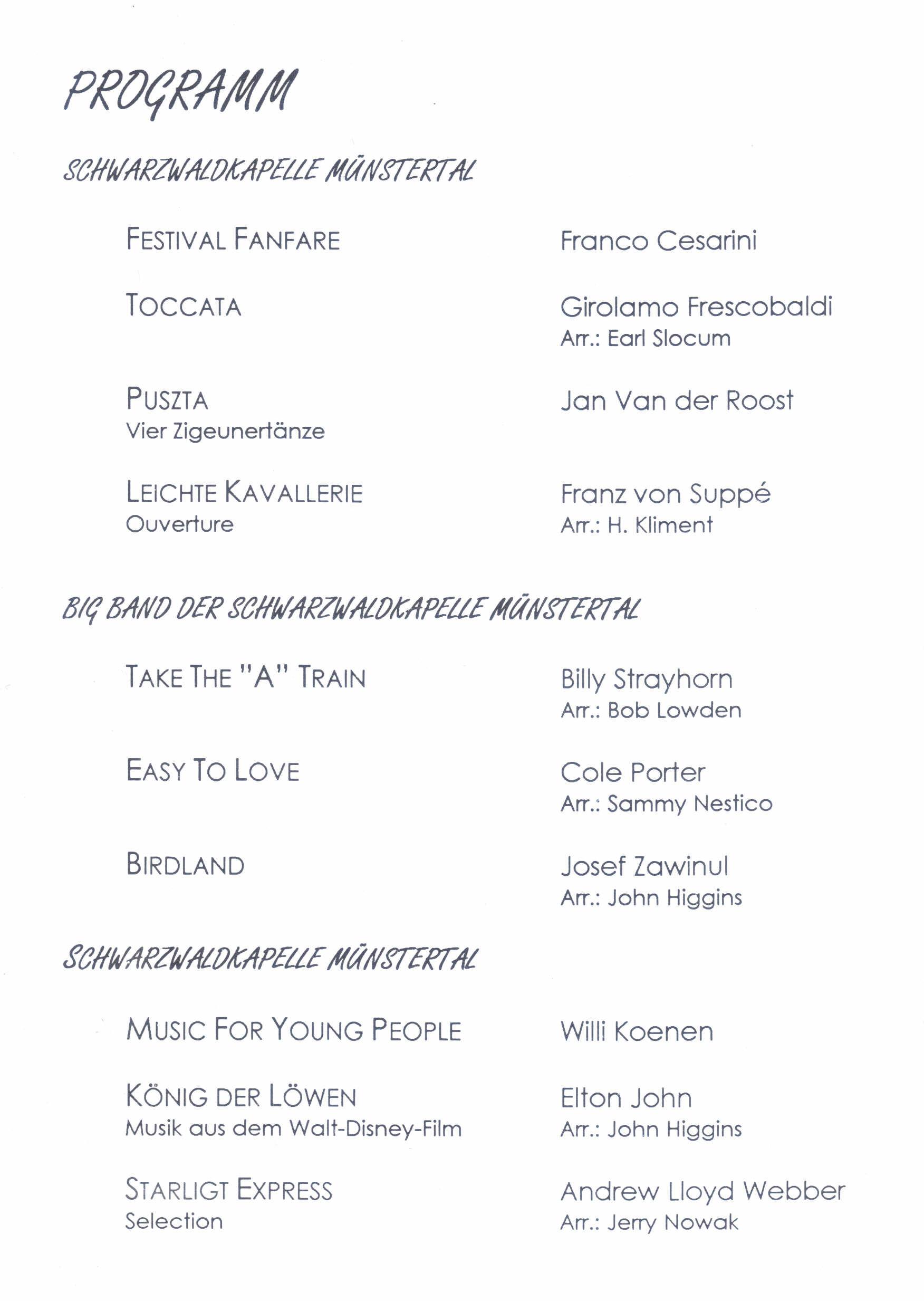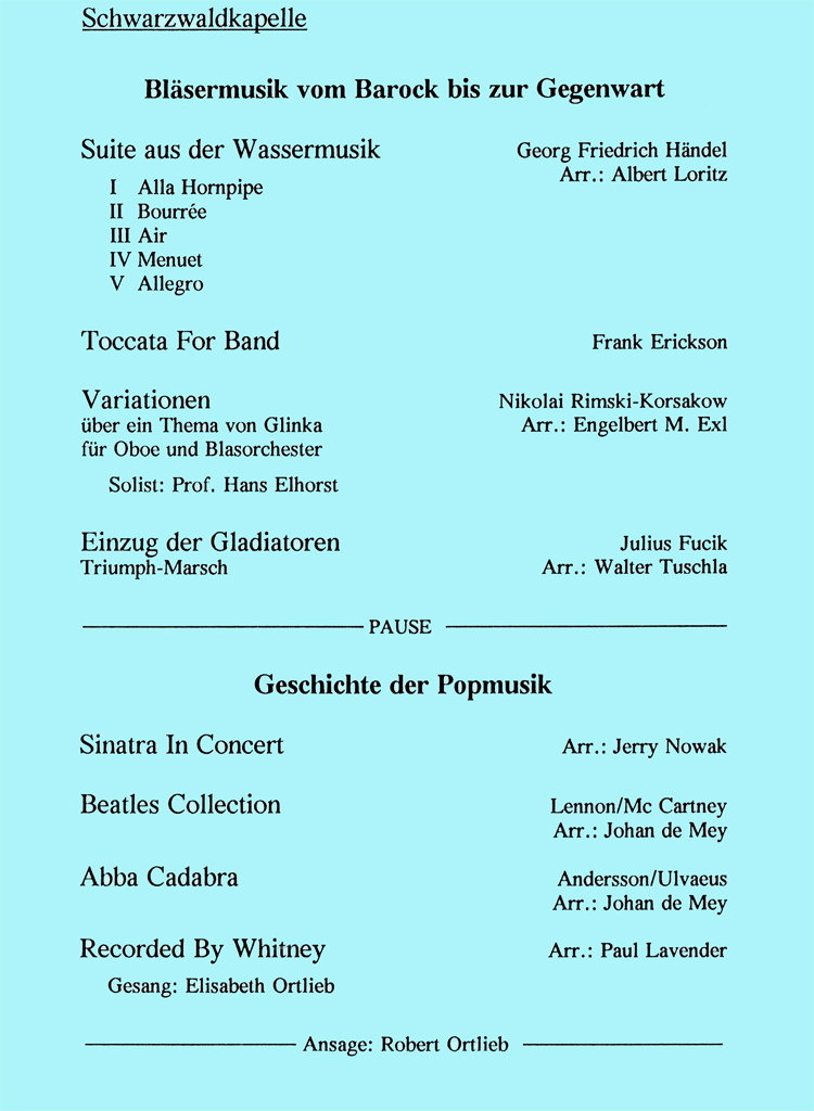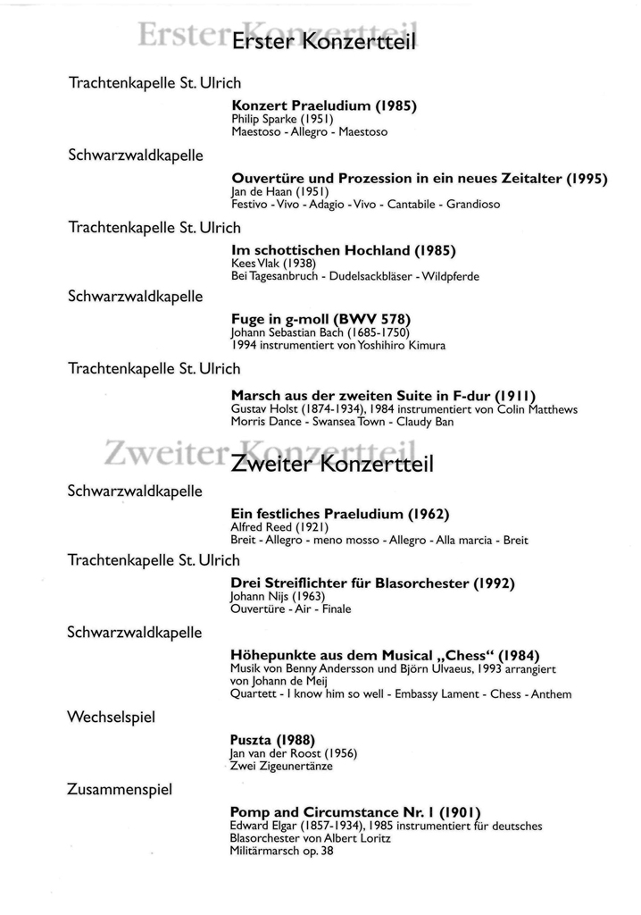 Natürlich gibt die Schwarzwaldkapelle neben dem Osterkonzert noch viele weitere Konzerte, wie zum Beispiel Kirchenkonzerte und Unterhaltungskonzerte. Deren Programme hier alle aufzuführen, würde aber den Rahmen sicherlich sprengen.